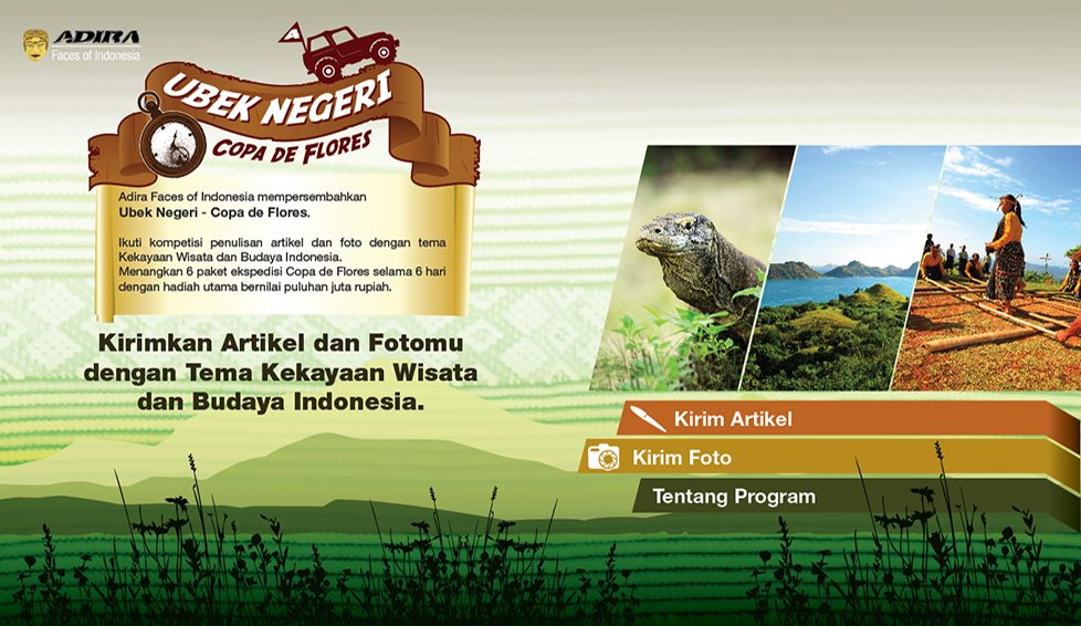 Setelah sukses dengan beberapa program sebelumnya (Best Adira 100 Faces of Indonesia, Adira Beauty X-pedition dan Jelajah Bumi Papua) pada awal tahun 2013, Adira FOI kini kembali mempersembahkan program terbaru, yaitu Ubek Negeri – Copa de Flores. Ubek Negeri – Copa de Flores adalah ajang kompetisi karya tulis dan foto dengan tema Kekayaan Wisata dan…